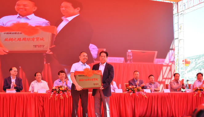 副总裁、定西亿联国际商贸城董事长雷茂顺授予了中国商业联合会“丝绸之路国际商贸城”牌匾。