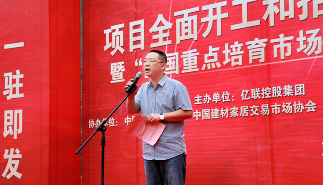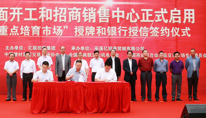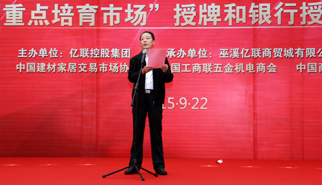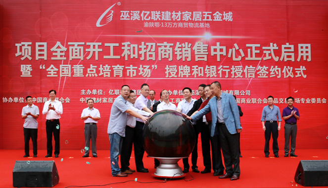 在活动仪式上,重庆市商委副主任蒋寿光、县长龚均、巫溪亿联建材家居五金城董事长夏守亦分别发表了讲话。在现场上千名与会人员的共同见证下,全国工商联五金机电商会会长劳健斌先生、中国建材家居交易市场协会常务副理事长林小平研究员分别授予巫溪亿联建材家居五金城“全国重点培育市场”牌匾;同时,夏守亦董事长代表巫溪亿联向巫溪县教育基金会捐赠100万元,获得现场观众一致热烈的掌声。当县委书记唐德祥在喜庆的礼炮声中郑重宣布:“巫溪亿联建材家居五金城项目全面开工,招商销售中心正式启用”时,整个活动掀起高潮。