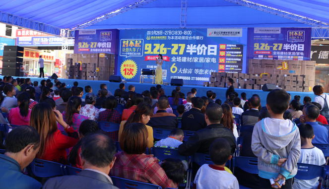 9 月26日,被众多消费者所期待的营山亿联“半价日”活动终于揭开了它神秘的面纱。“9.26-27半价日”活动期间,营山亿联建材家居五金城百余品牌,推出一年仅有的一次的全场半价日活动,全场建材、家居、家电全场定单半价,近万人到场。