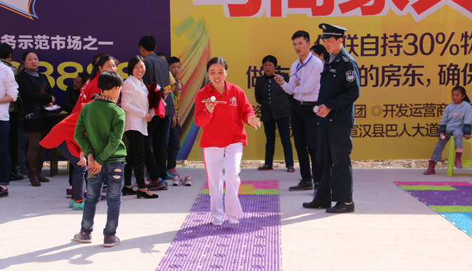 在三个广场表演的同时,招商销售中心的游园会也在同步举行。招商销售中心门口设置了5个游戏区域,踢毽子、跳绳、指压板跑、投壶、竹签游戏,过关即有奖,保温壶、三件套、水晶杯、雨伞,过关门槛低,参与人数众多。