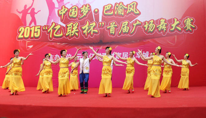 6月21日,在位于云阳县港贸大厦的亿联建材家居汽车城招商销售中心广场,中国梦•巴渝风——2015首届“亿联杯”广场舞大赛盛大举行,吸引了来自全县各个社区共29支代表队伍、600余名表演者前来参赛。
