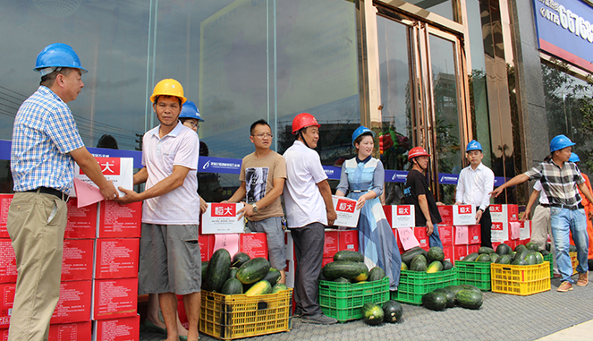 7月20日,北流亿联建材家居五金城总经理蓝金平率公司中高层管理人员,对项目建设施工单位各班组进行夏日慰问,为奋战在工地的一线施工人员送上了矿泉水、西瓜、防暑药品等慰问品。