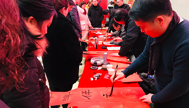 满满的年味,映得大家喜气洋洋。前程似锦、春满人间、五福临门、财源广进、万事如意、四季平安.....大家对新年美好的祝愿都写在这些春联上了!动手写春联或“福”字不仅是人们祈求平安、吉祥的代名词。在现场群众的笔下,一个个“福”字跃然纸上,锁住了一整年的新春祝福。前来参与活动的粉丝们个个热情饱满,非常享受这提前到来的“年味儿”!(王落落)