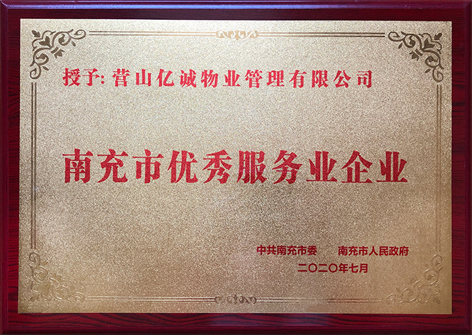 7月27日,在刚刚结束的2020年度南充市优秀服务业企业评选中,营山亿联项目物业服务方——亿诚物业管理有限公司荣获“南充市优秀服务业企业”称号。