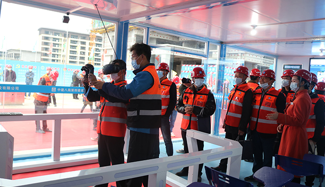 参会人员观摩基础桩头样板、地下室结构样板、楼梯样板、框架柱样板、剪力墙样板、屋面样板、实体样板、钢筋加工区与材料样板展示区、VR 体验馆等安全文明规范现场。(林万霞)