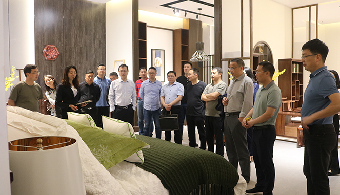 考察团一行来到天荣家居体验馆,了解智慧小镇项目发展规划、线下产业与线上电商融合发展模式,查看家居产品种类和款式,体验智能化家居在生活中的应用。