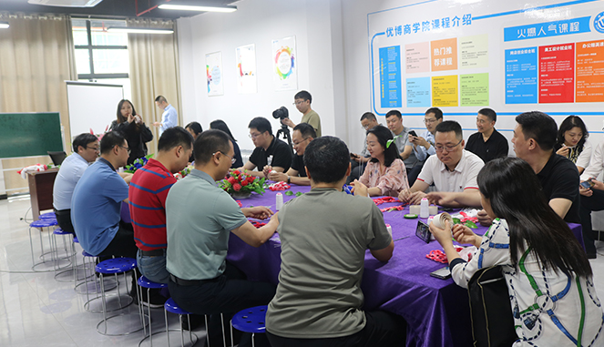 随后,考察团在优博商学院还体验学习了手工艺品丝网花的制作流程和方法。(林万霞)