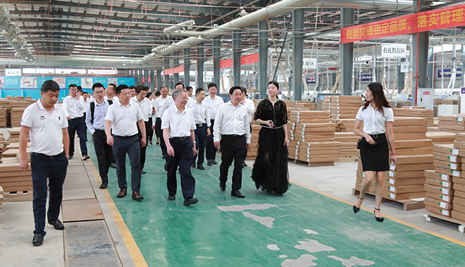 在天荣家居生产车间,蒲继承区长调研智能家居生产设备和家具产品生产流程,了解家具生产情况、销售情况和运营情况。