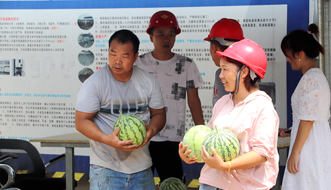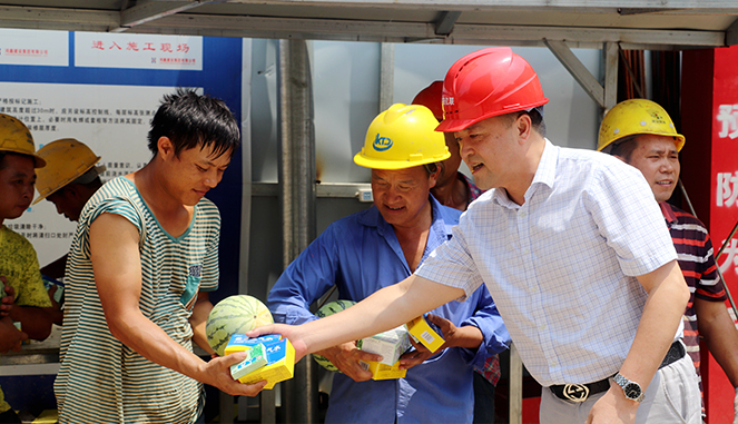 7月19日,东安亿联国际商贸城总经理郑永敏来到施工现场开展夏日慰问活动,为一线施工人员“送清凉”。活动现场,亿联向施工单位、监理单位、勘探单位送上了藿香正气水等防暑药品和一整车甘甜的西瓜。