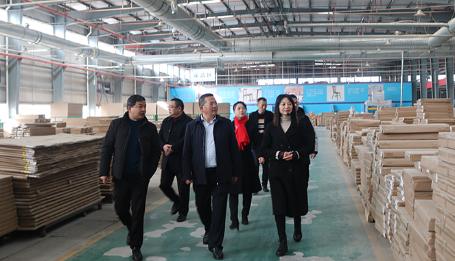 在天荣家居生产车间,田国华一行参观了智能家居生产设备和家具产品生产流程,了解家具生产情况、销售情况和运营情况。