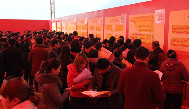 9:08时,随着主持人将第一轮幸运客户的抽出,被抽中的客户兴高采烈地前往选铺,没被抽中的客户在急切地等待。随着现场报喜员此起彼伏的声音,恭喜张先生成功选购6套商铺,恭喜李先生成功选购8套商铺,现场掌声一浪高过一浪,销控区的房源不断地被贴上红色的标签,许多购房客户在十几名引导员的带领下快速地到财务区交钱,然后在签约区签订购房认购协议,剩余的房源也在不断锐减,前场客户也在焦急地等待,已经按捺不住焦虑的心情,非常担心自己预选的房源被别人选走,所以现场主持人不得不加快选房速度。