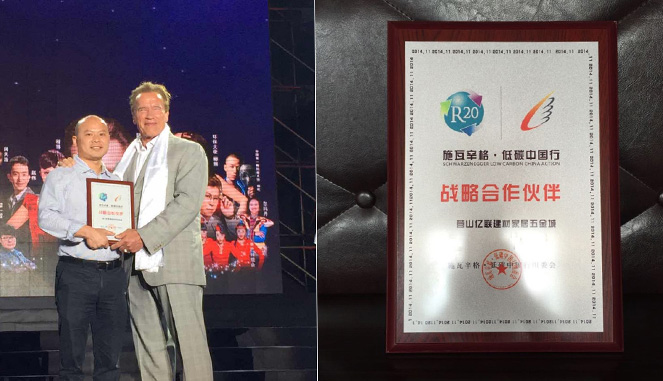 营山亿联作为市县双重点工程,积极倡导低碳生活和环保理念,同时得到了施瓦辛格•中国低碳行组委会的认可,被授予“施瓦辛格•中国低碳行战略合作伙伴”荣誉称号,施瓦辛格先生亲自为营山亿联建材家居五金城授牌。