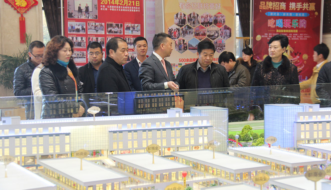 在项目招商销售中心,公司负责人向彭全宇主任一行详细介绍项目工程进度情况,当得知项目将于2016年便能交付商家装修,“明年十一”前后可进行试营业,再次对亿联“一年建成、两年开业、三年旺市”的速度表示赞赏!