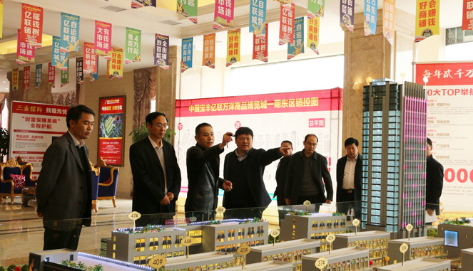 3月17日下午,平顶山市市长张国伟,宝丰县委书记张庆一,县长许红兵,县委常委、县委办主任赵二成,县政府副县长王长和,县政府党组成员陈卫东以及县政府办、杨庄镇和县特色商业区等单位领导一行到宝丰亿联万洋商品博览城项目考察工作。