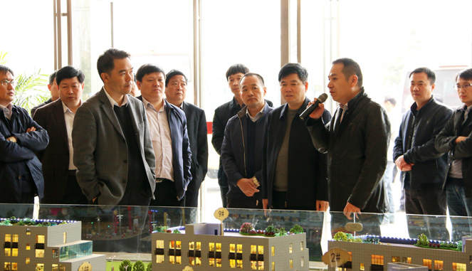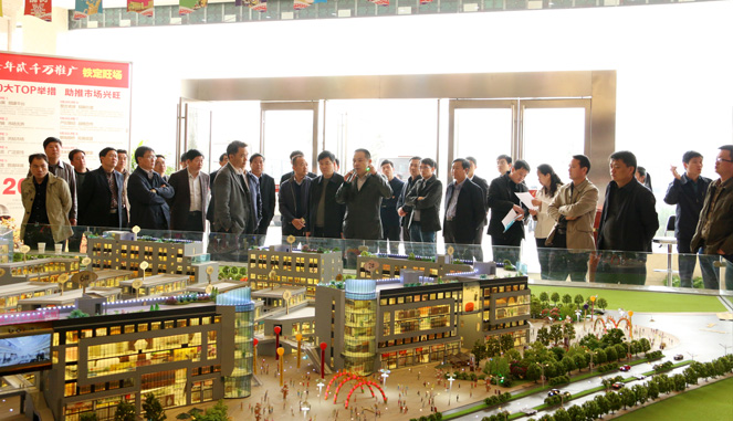 考察代表团一行,在亿联万洋商品博览城沙盘模型前驻足听取了项目总经理蔡祈远关于项目推进情况的详细汇报。