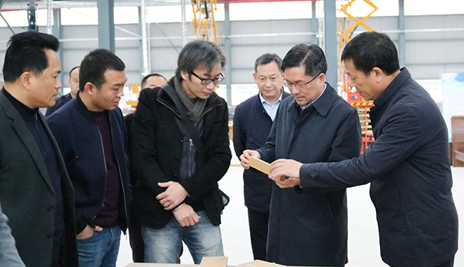 在智慧小镇智能制造一期智能家居生产现场。智能家居负责人叶凯东汇报了智能家居的试生产情况,介绍了家居生产的细节流程,就家居研发设计、材料选择、营销模式进行了详细阐述。张定宇副主任特别关心企业的发展,并就整体营商环境、政府政策、甚至用工情况、水电费用等细节问题进行了详细询问和了解,并提出指导意见和合理建议。