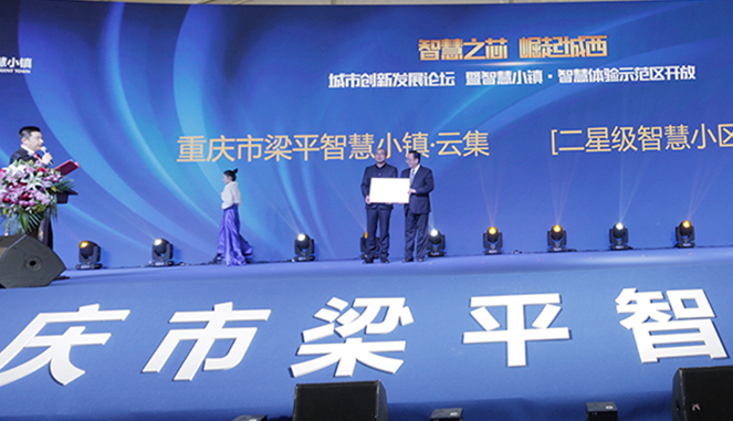 授牌仪式上,梁平区人大主任、智慧小镇项目指挥部指挥长郑云山向智慧小镇项目常务副总经理陈昌寿授予智慧小镇·云集项目“二星级智慧小区”牌匾。