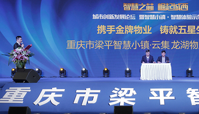 签约仪式上,重庆龙湖物业公司代表--龙湖智慧服务市场发展总监印奇武与重庆市梁平智慧小镇项目副总经理谢理想进行智慧小镇·云集物业服务签约。