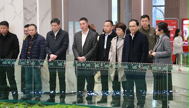 陈作荣一行参观了蛟龙出海·游客中心巨型沙盘并观看了项目宣传视频,详细了解了项目进度及整体施工情况,对华东大峡谷氡泉旅游度假区项目的建成表示期待。