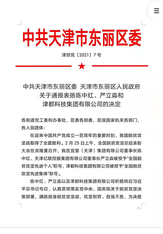 有限公司董事长严立淼和“全国脱贫攻坚先进集体”获得者津都科技集团有限公司,给予通报表扬,并号召全区人民向他们学习。