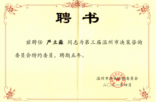 严立淼同志被聘为第三届温州市决策咨询委员会特约委员