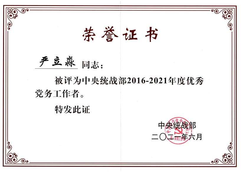 被中央统战部评为2016-2021年度优秀党务工作者称号